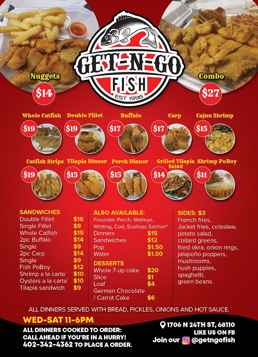 Welcome to Get N Go Fish, where the best of southern-style seafood meets Omaha’s vibrant dining scene! Nestled at 1706 N 24th St, this gem specializes in mouth-watering fish dishes that evoke cherished childhood memories for many patrons. The menu is packed with enticing options, from the crispy Whole Catfish served with two sides for just $20 to the flavorful Cajun Shrimp at $15.